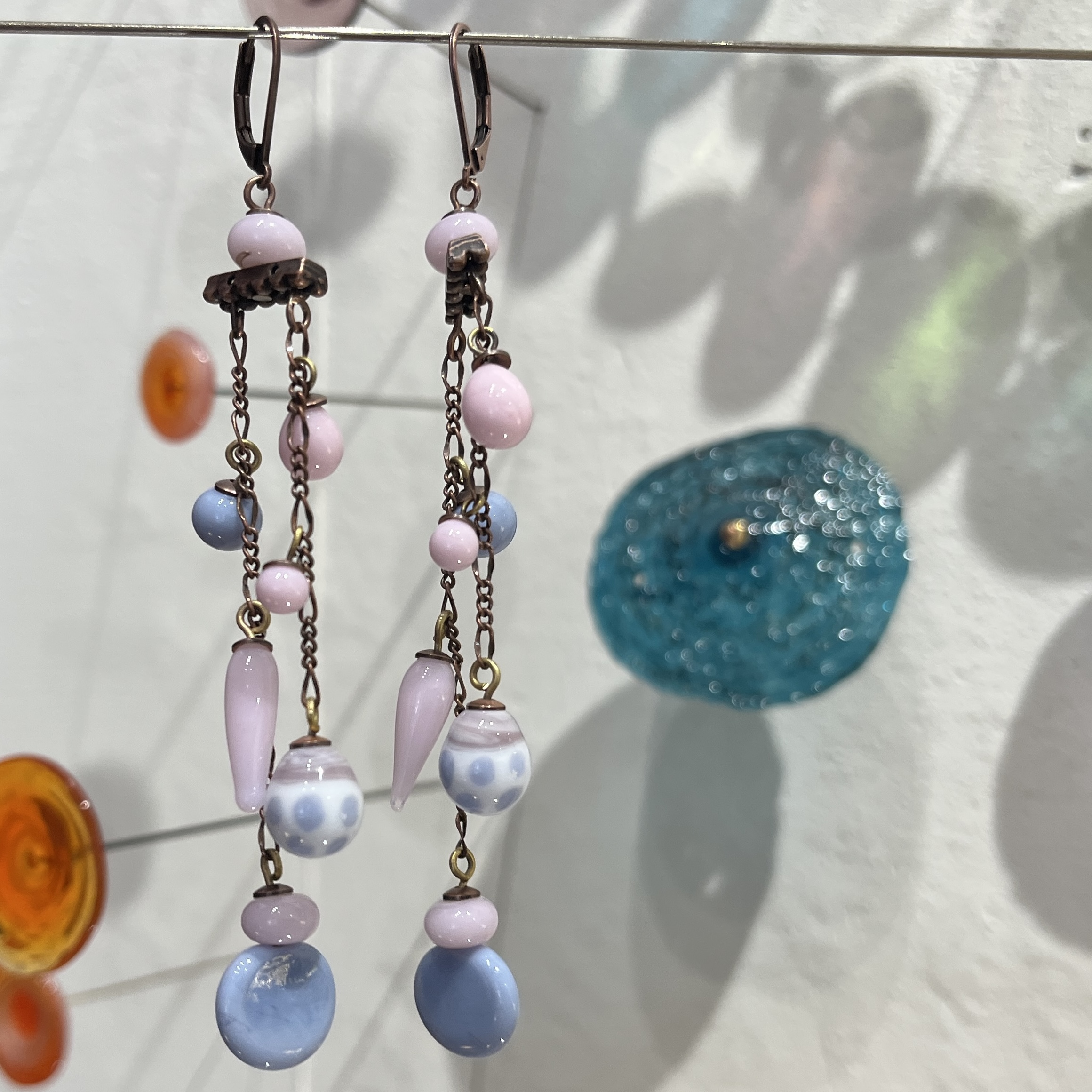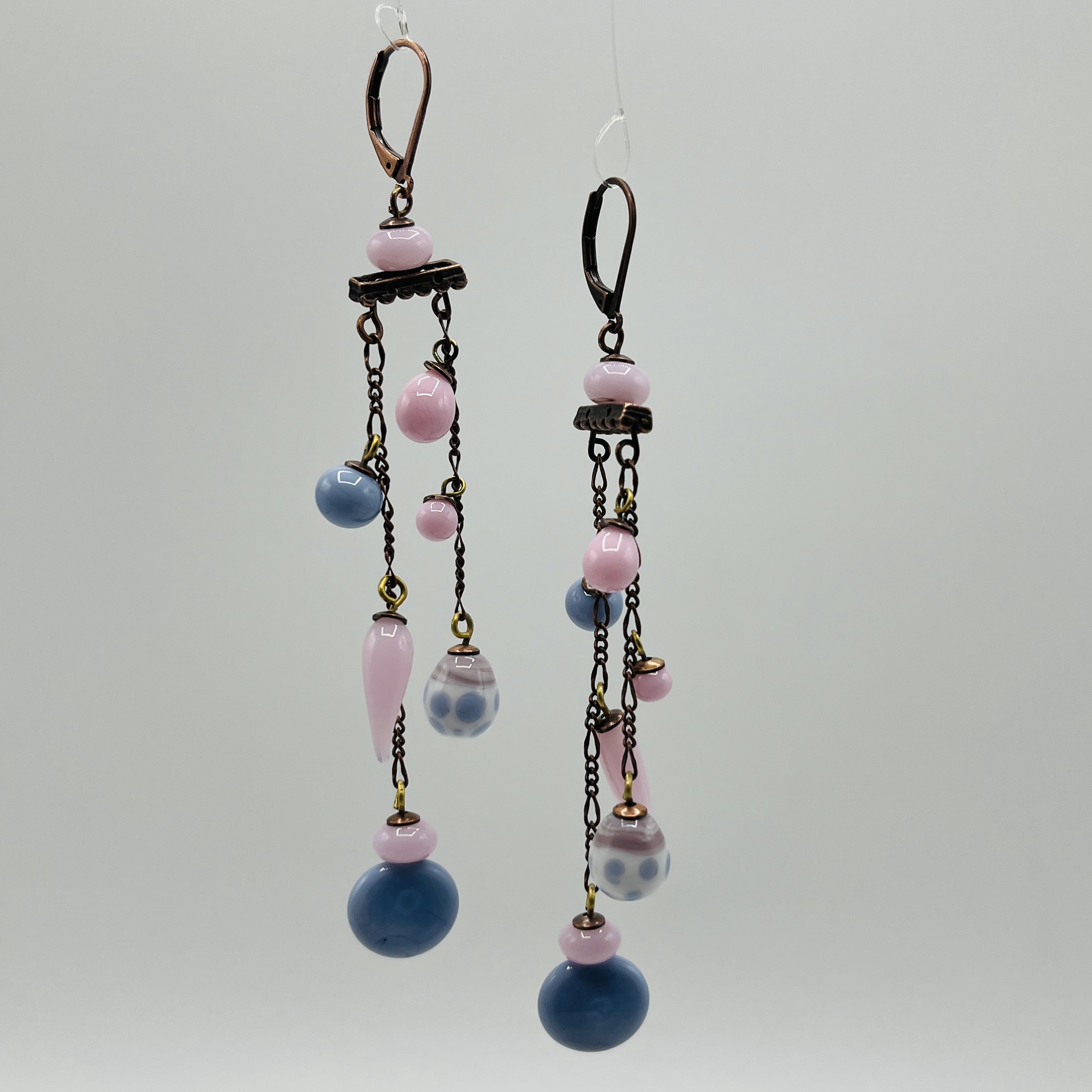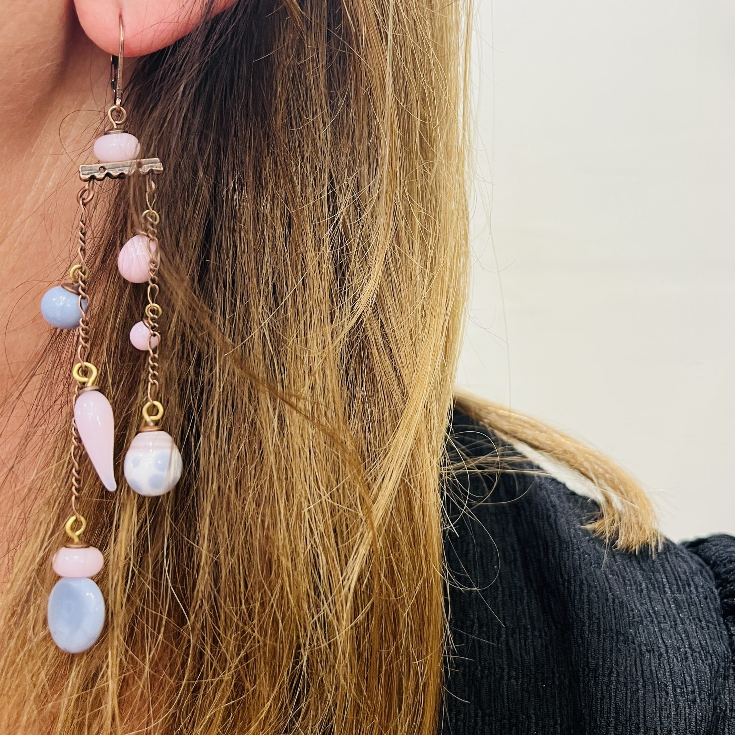Jolie descente de perles en verre de différentes formes dans des tons rosé, violet, parme, blanc et bleu ardoise clair
