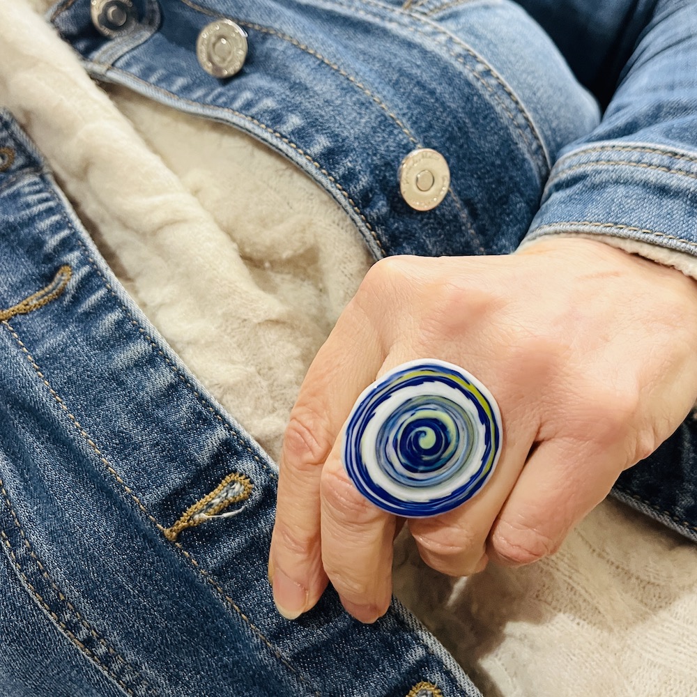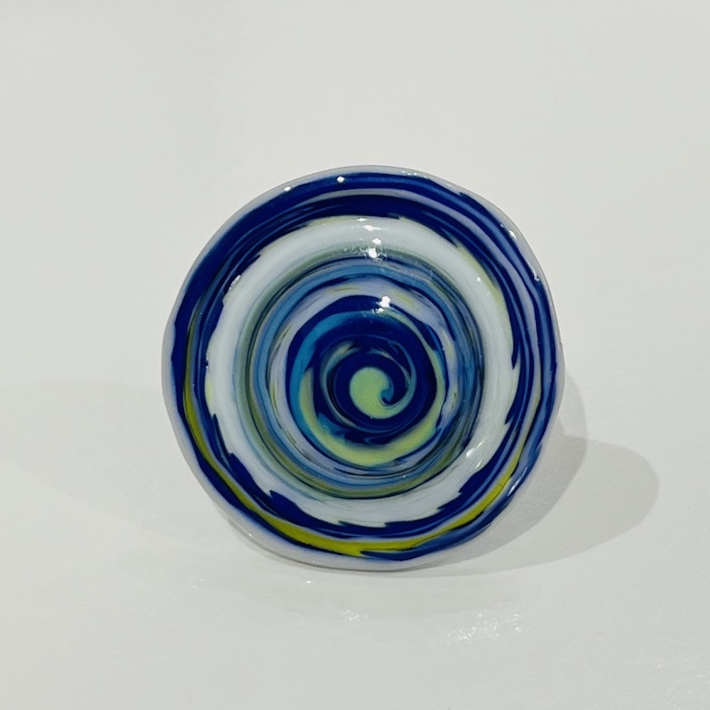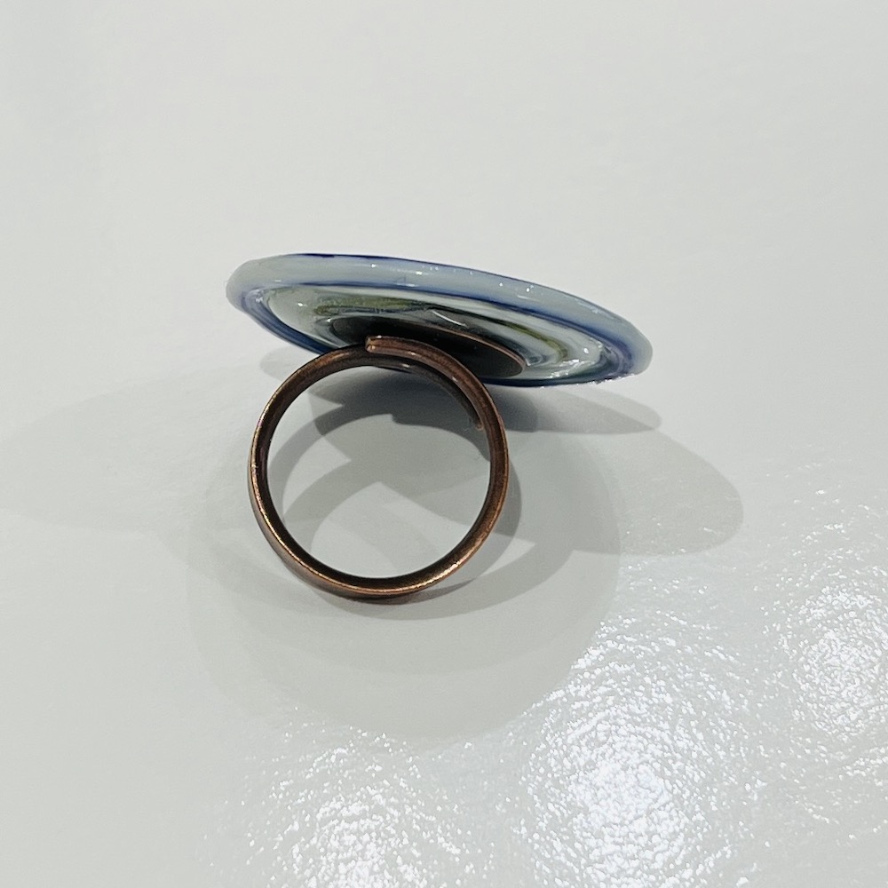 Pièce en verre réalisée au chalumeau et assemblée par collage sur un anneau bronze antique