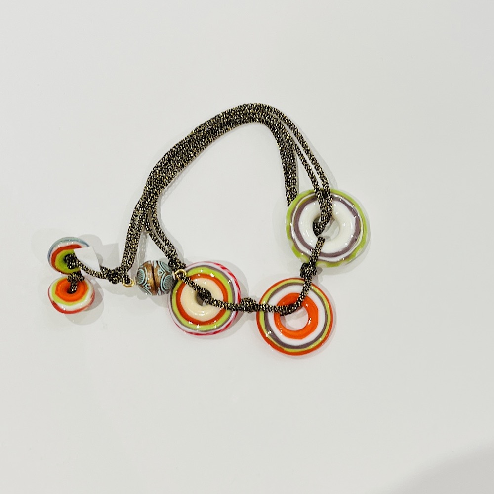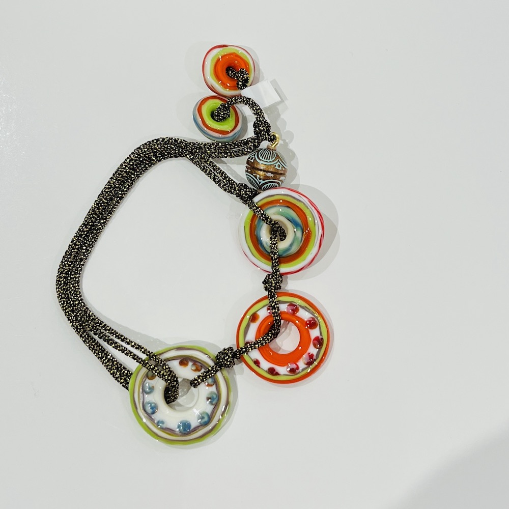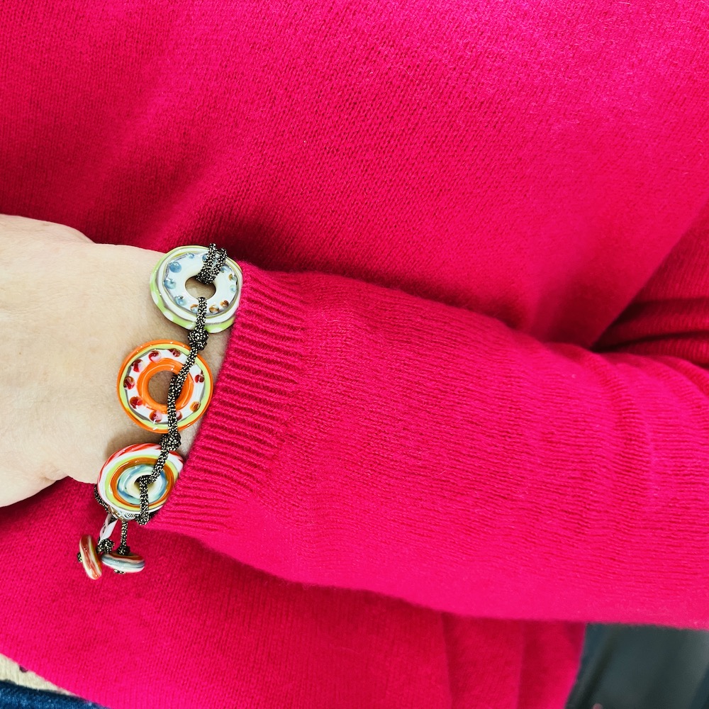 Bracelets composés de pièces en verre reliées par un textile noir/doré et fermé par un aimant.