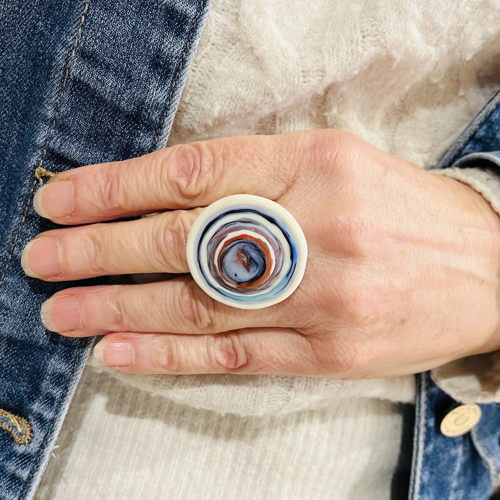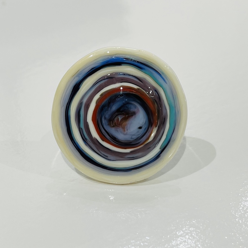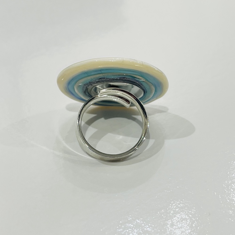 Pièce en verre réalisée au chalumeau et assemblée par collage sur un anneau bronze antique
