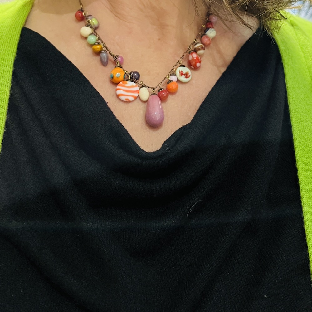 Un esprit de fête pour ce collier aux pièces de différentes formes assemblées sur une chaine en aspect bronze antique et fermoir aimanté original