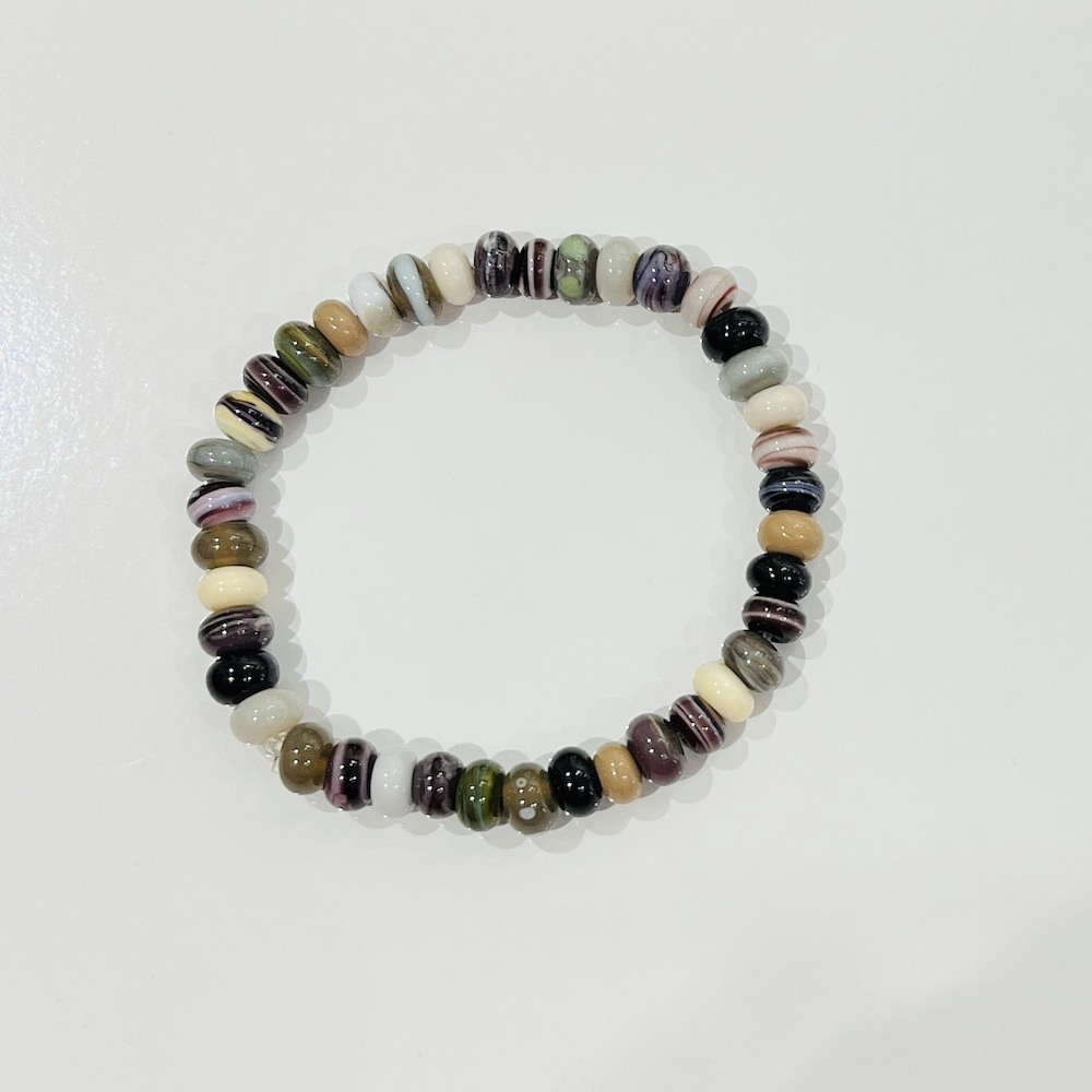 Bracelet composé de perles en verre dans des nuances de vert, noir, beige, gris,kaki,marron