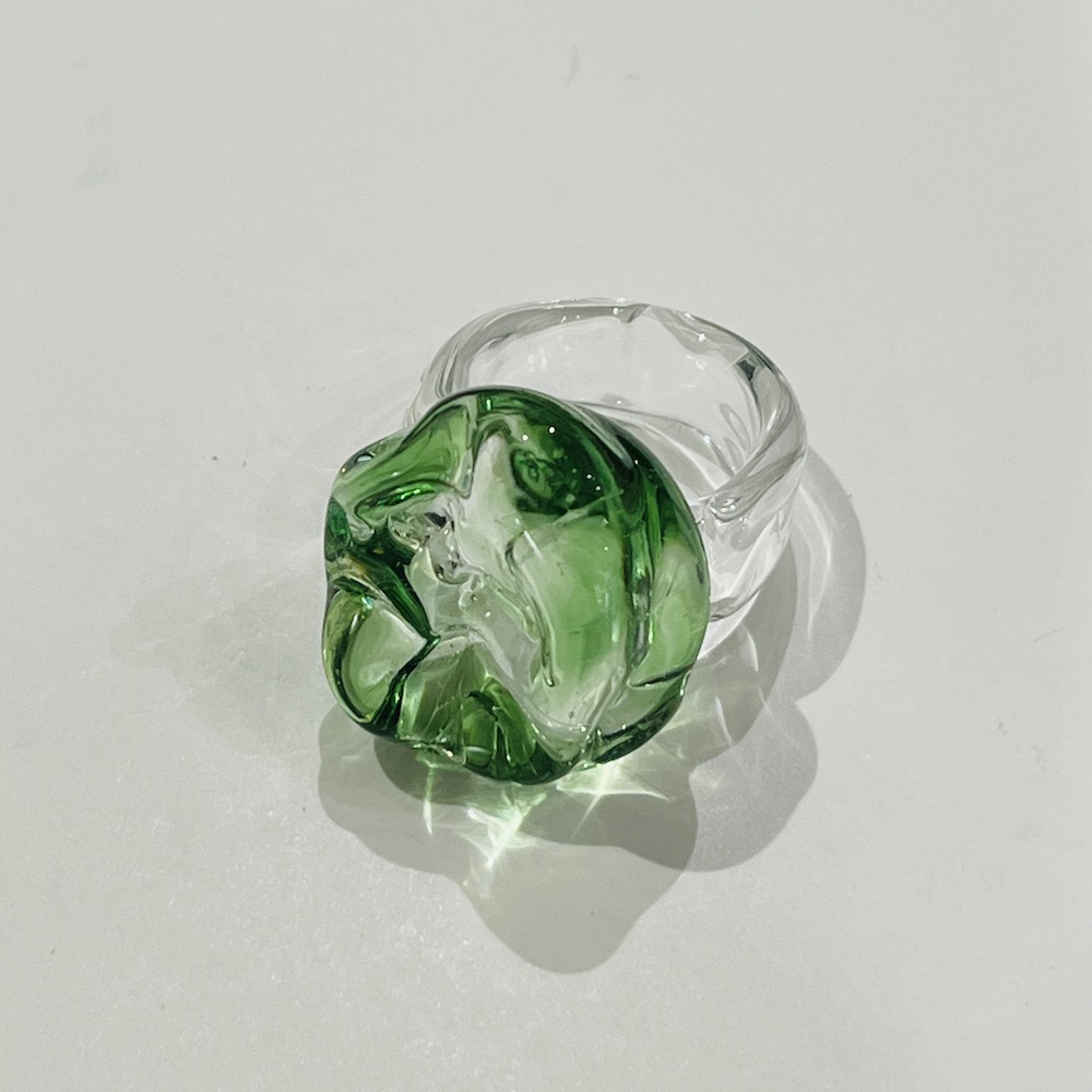 Bague en verre transparent réalisée au chalumeau en verre borosilicate (verre très résistant aux chocs) et recuites afin d’assurer une solidité optimale. Un petit glaçon irrégulier posé sur la main qui capte la lumière.